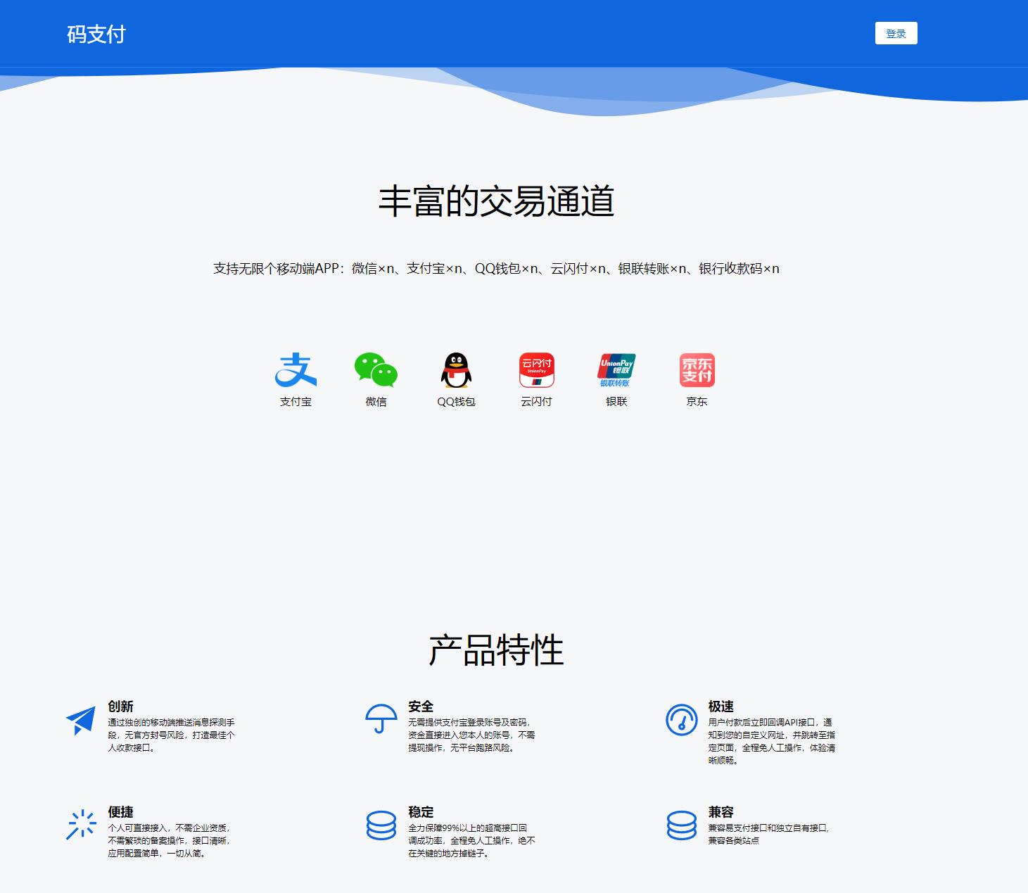 平 台 介 绍 无需营业执照个人可申请 专业客服服务,7*24小时技术支持,不做二清,不碰钱,微信支付宝收款码可直接收款. 接口安全 采用国内服务器,接口稳定传输,给顾客快速流畅的体验,安全可靠的服务您的每一笔订单. 费率超低 接口渠道直接到自己账户,省去中间商赚差价,因此我们可以给商户提供更低廉的费率. 资金保障 商户订单信息,全部加密处理,专业技术24小时实时运维,您的帐户安全将得到充分的保障. REST API 提供了完善的API接口,你可以用于平台应用通道接入,开发各种系统的对接通道插件等. 专属客服 专业客服团队,专属客服一对一贴心服务,7*24小时全天候在线为你解答. 拒资金流 只负责交易处理不参与资金清算,资金全都实时到您的个人账户上,以此来保障您的资金安全